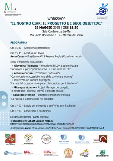 “IL NOSTRO CIAK!”, è un progetto promosso da UILDM sezione di Mazara del Vallo, in partenariato con Circolo Legambiente Francesco Lojacono, Fiadda Roma APS, Fiadda APS, AVI UMBRIA APS, Associazione Atlantis 27 ODV, ANIS Regione Puglia, Fish FVG, Fish Calabria, Associazione Insieme Verso Nuovi Orizzonti ODV, Associazione Crescere Insieme e Fondazione Messina – Ente Filantropico, ammesso al finanziamento del Ministero del Lavoro e delle Politiche Sociali attraverso l’Avviso 2/2024, relativo ad iniziative promosse ai sensi dell’articolo 72 del D. Lgs. 3 luglio 2017 n.117 (Codice per il Terzo Settore).